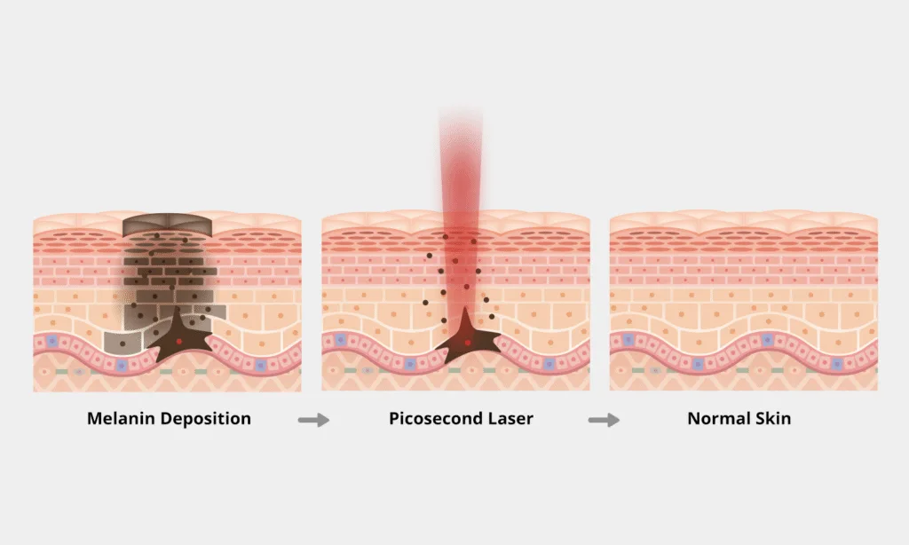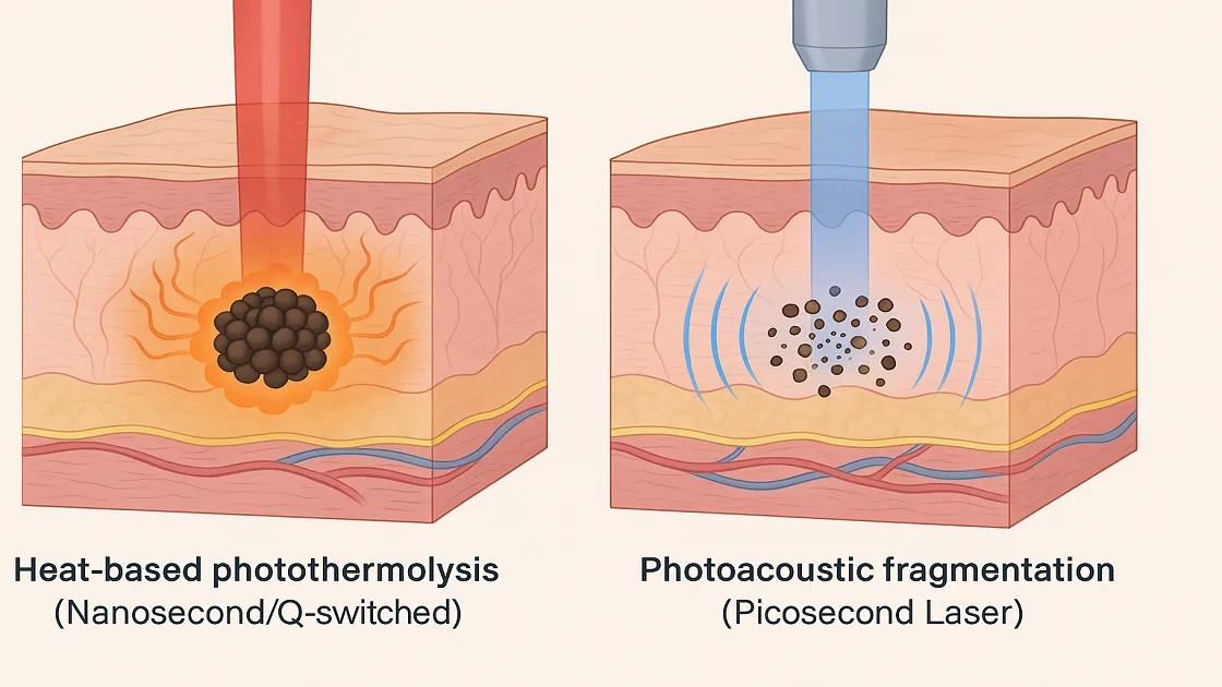 Picosecond lasers deliver ultra-short bursts of energy in trillionths of a second, using a mechanical (not thermal) effect to shatter pigment. This reduces skin damage, speeds healing, and improves precision over nanosecond or Q-switched lasers.